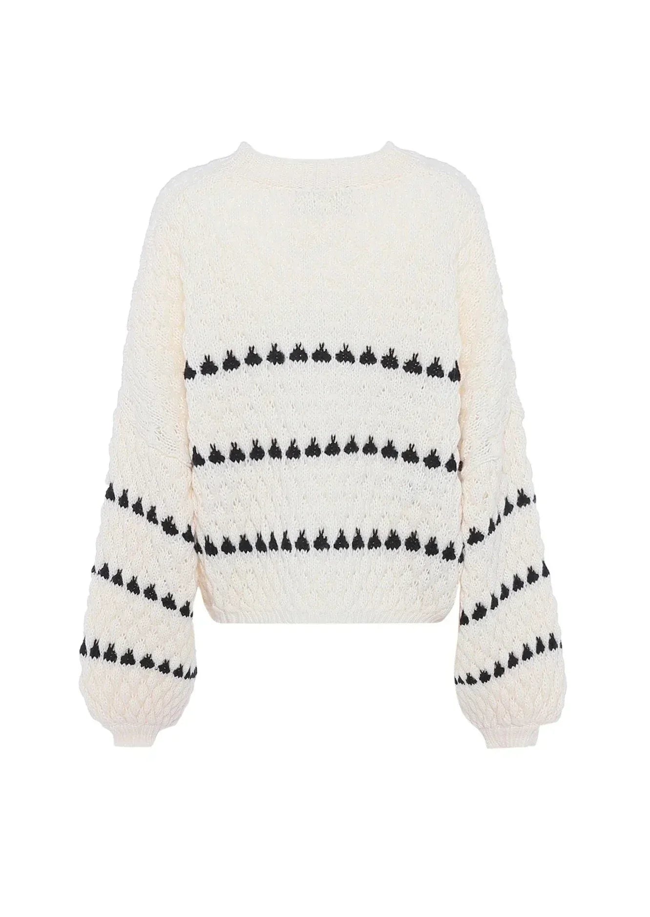 Acurrúcate con Serena. Esta suave mezcla de algodón presenta una sutil técnica de punto burbuja que añade una delicada textura tridimensional. Presenta un estampado triangular negro en contraste en el cuerpo y las mangas que crea una estética minimalista y elegante. Con un corte extragrande y mangas globo, es perfecta para combinar con cualquier look y elevar el nivel del conjunto al instante.
